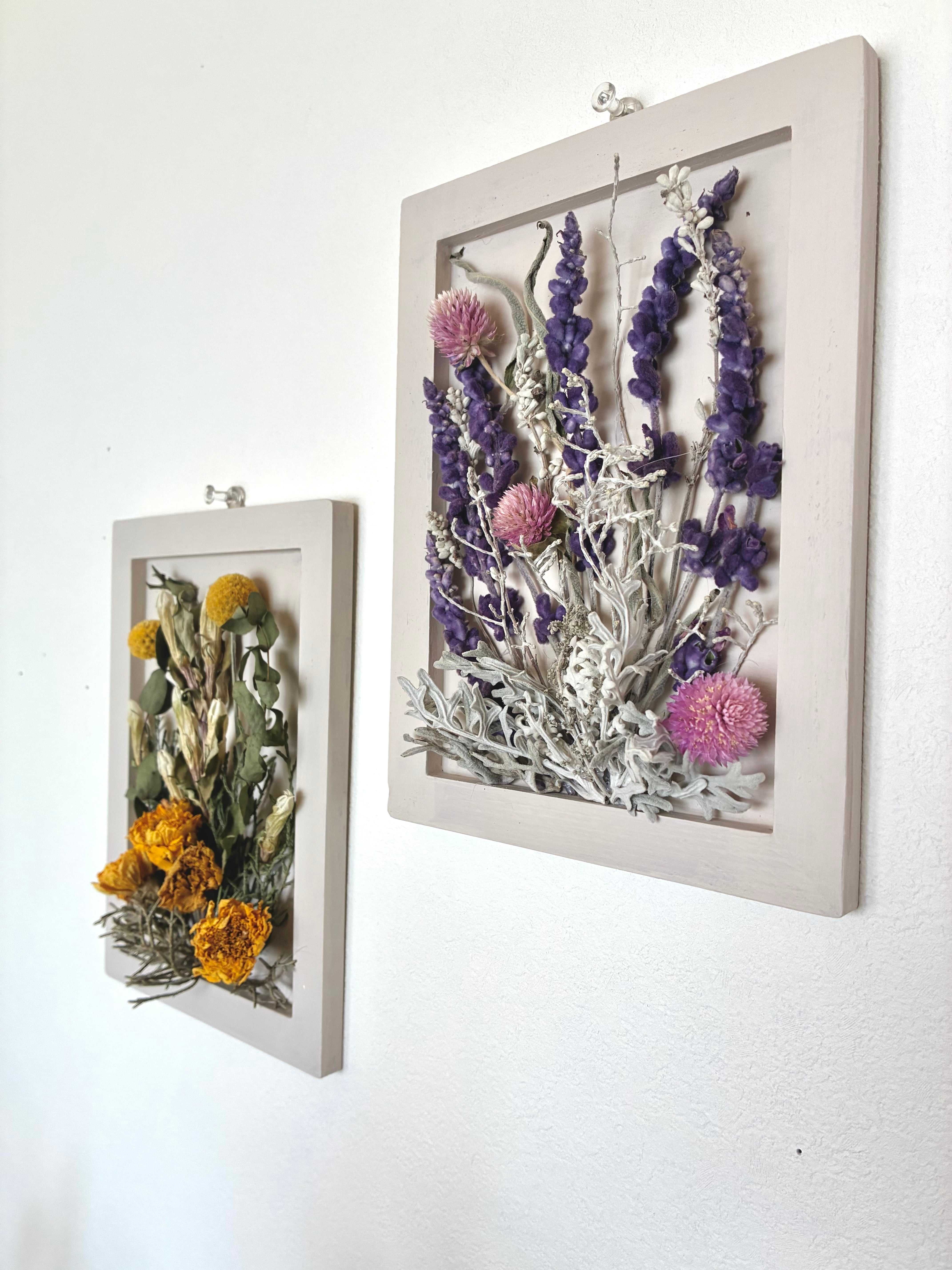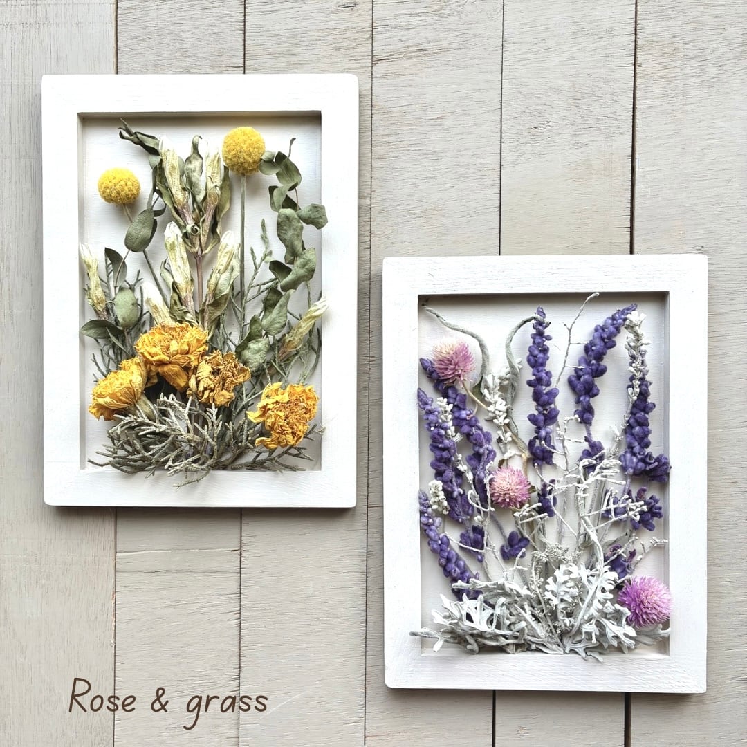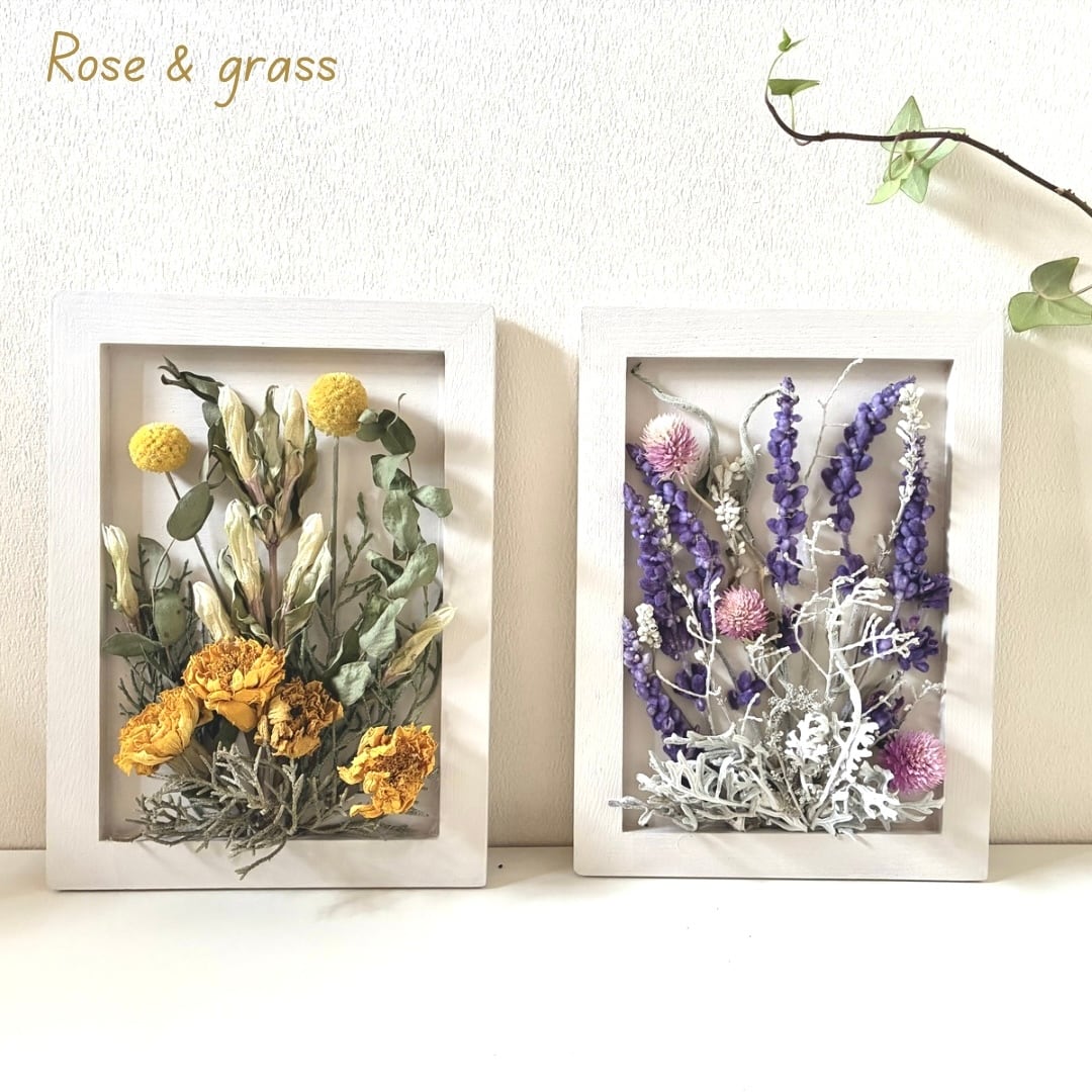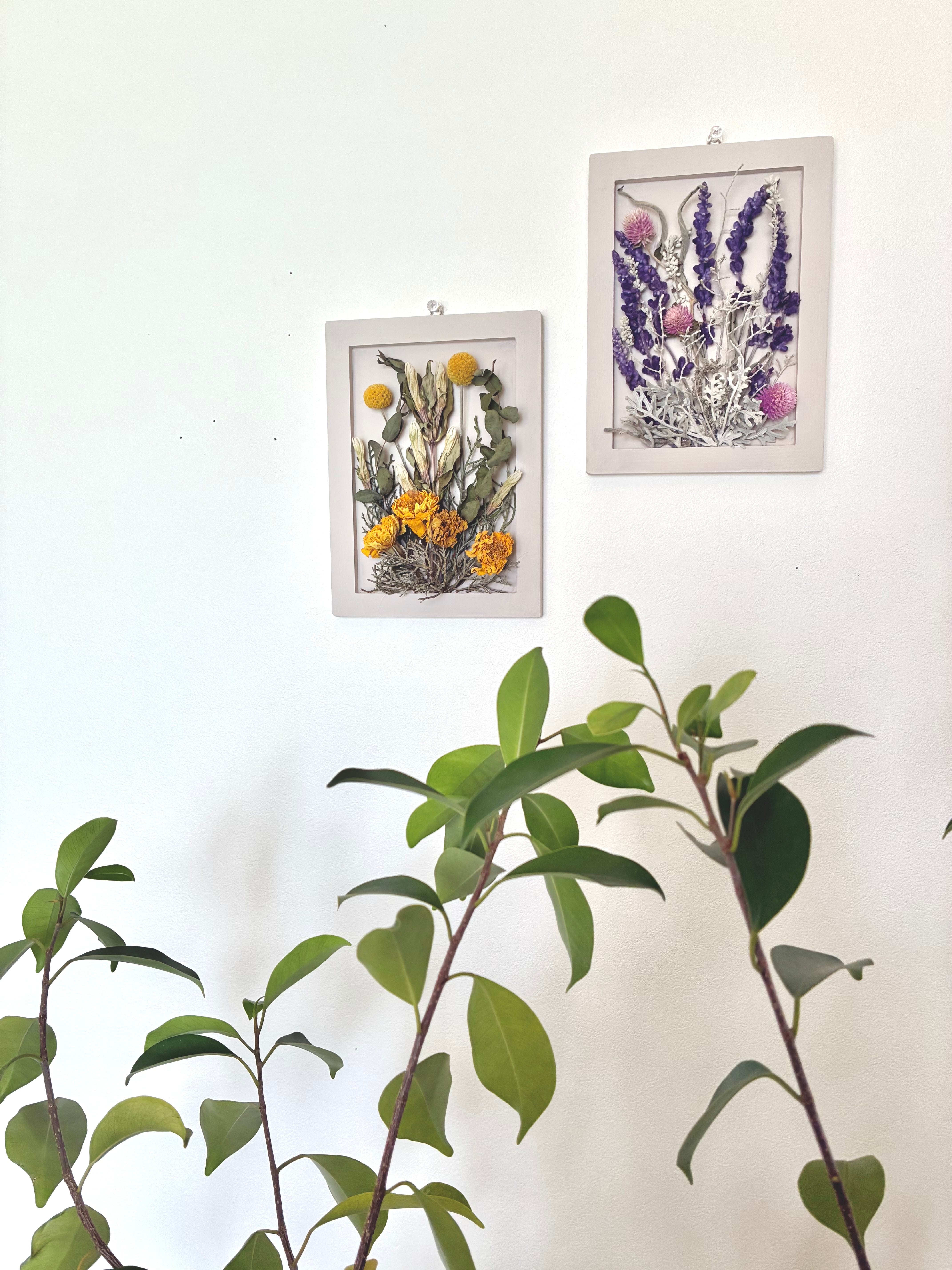 手作りのオフホワイトフレームにイエローベースとパープルベース、自然素材にこだわった2点セットでお届けします。