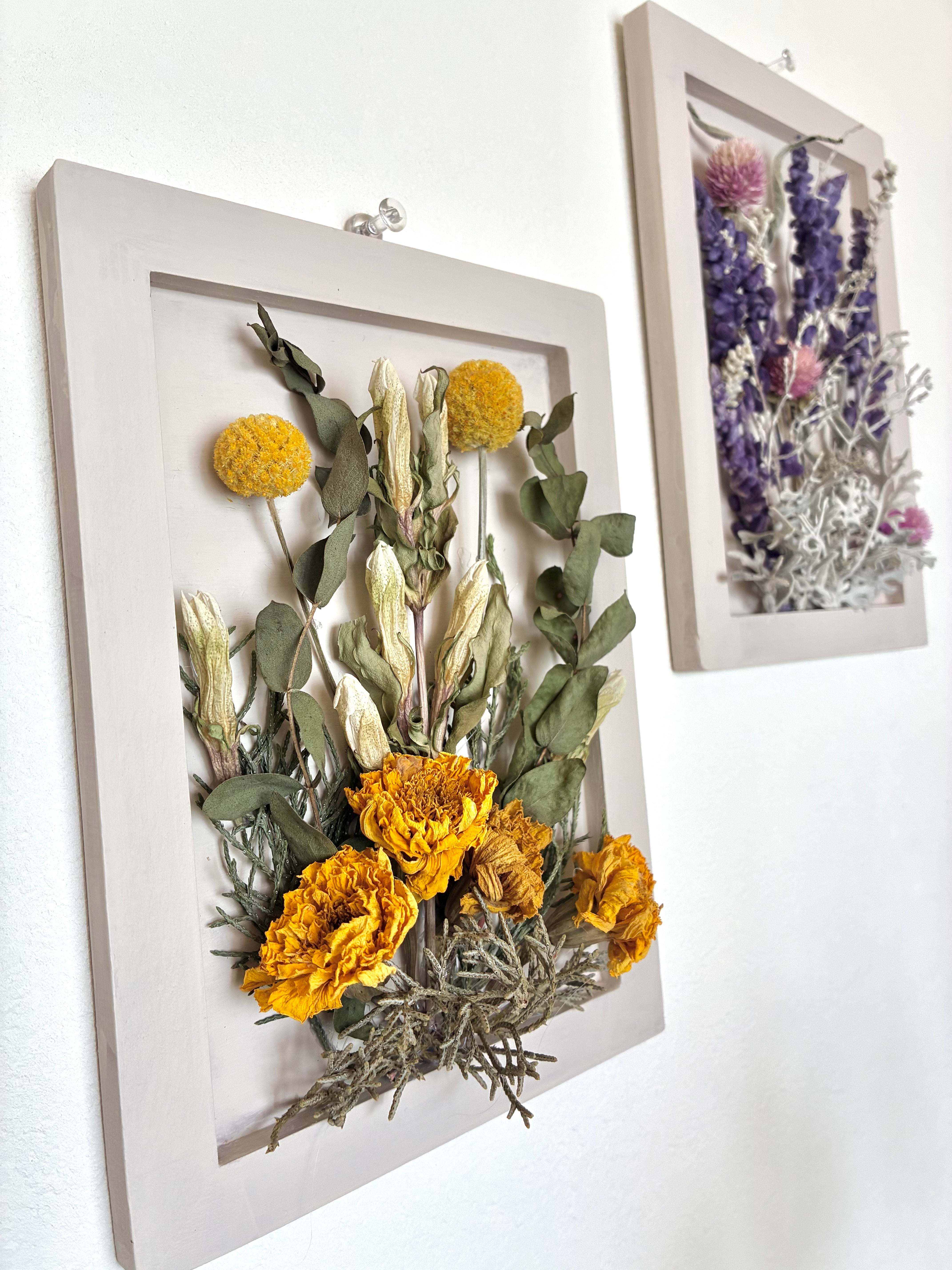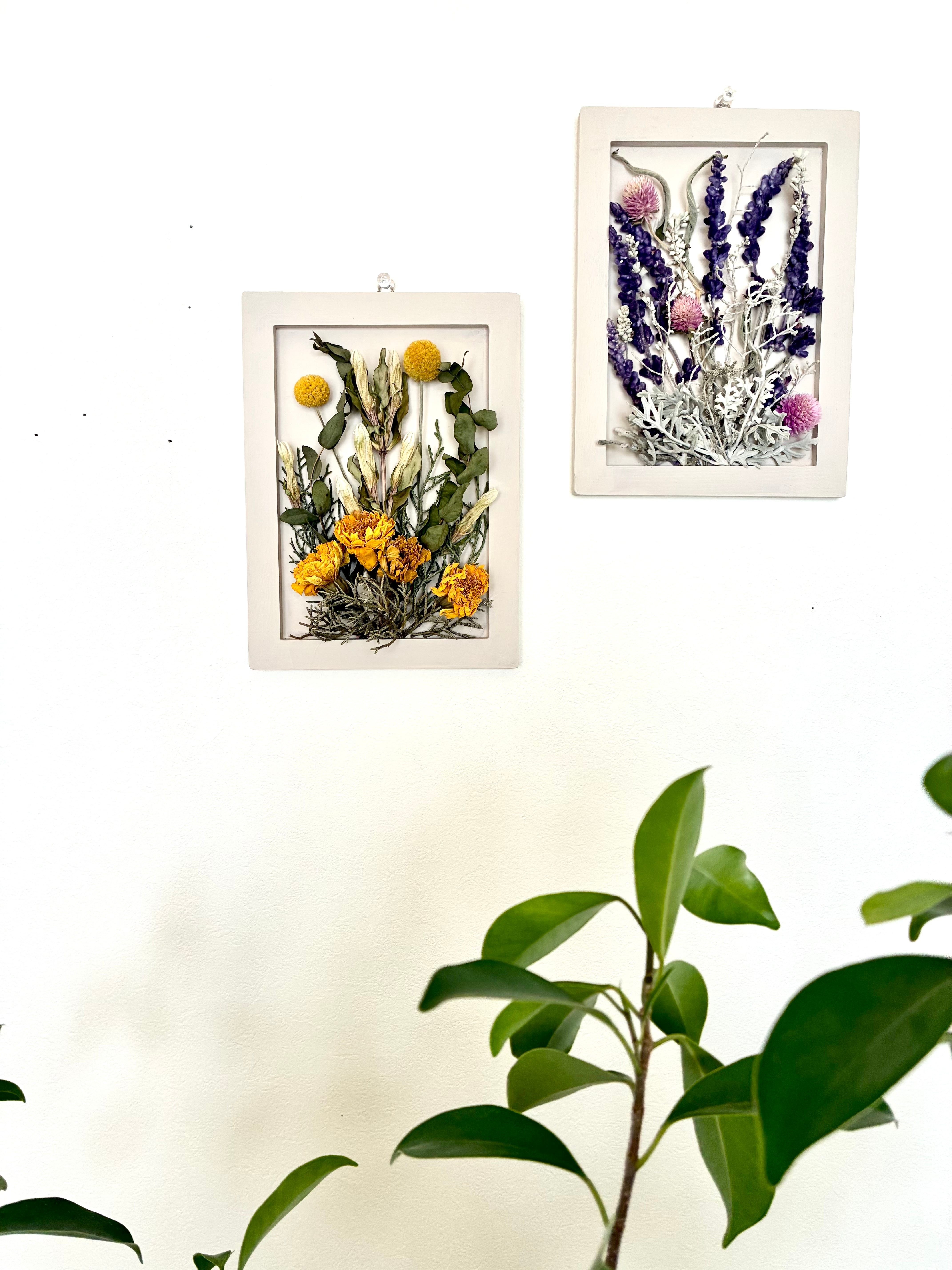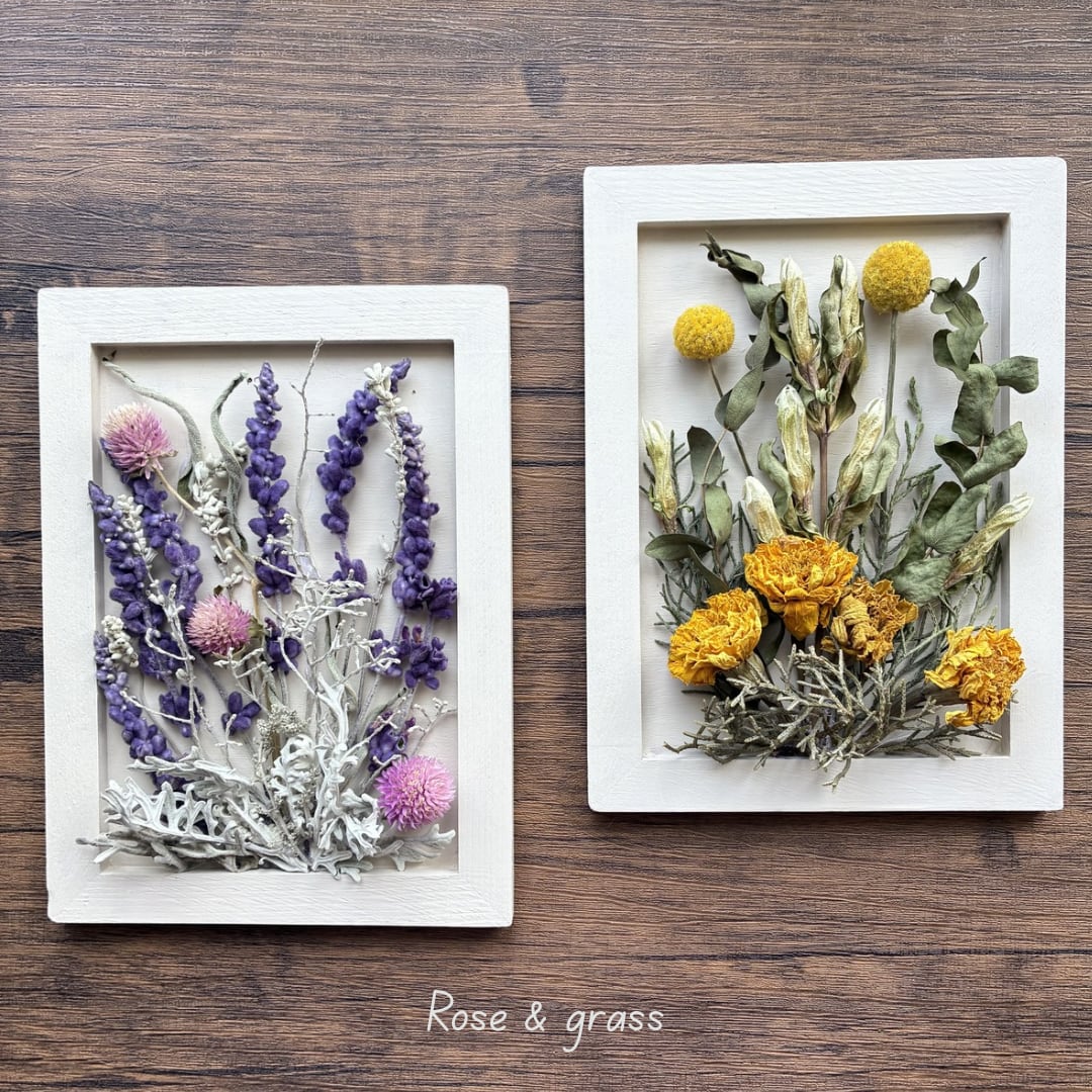 手作りのオフホワイトフレームにイエローベースとパープルベース、自然素材にこだわった2点セットでお届けします。