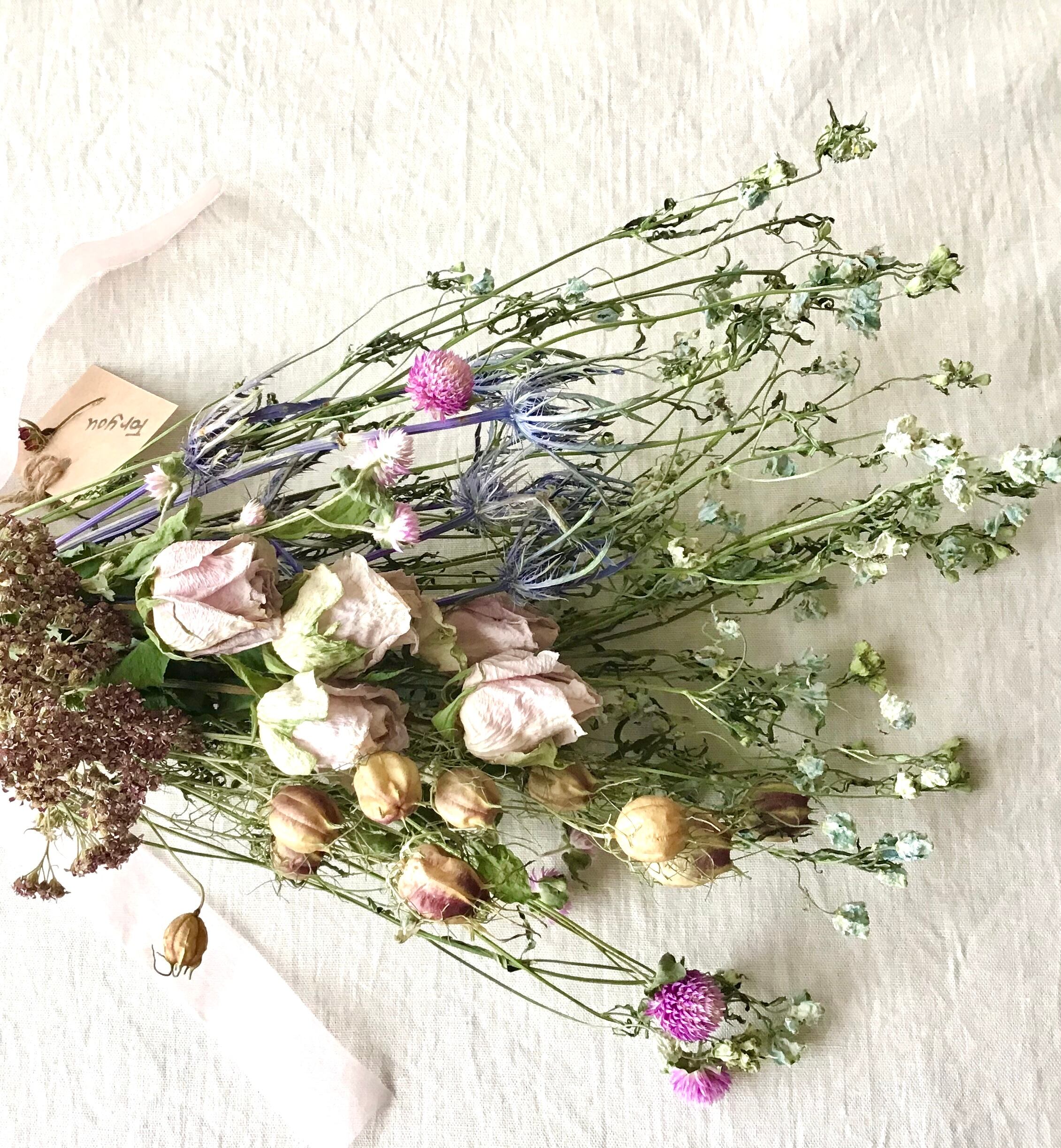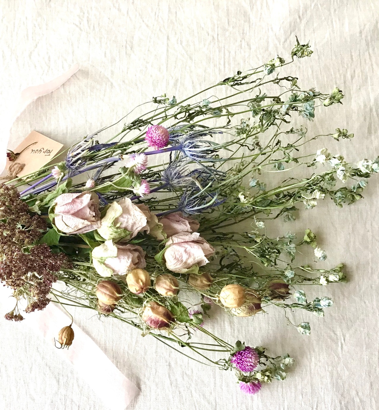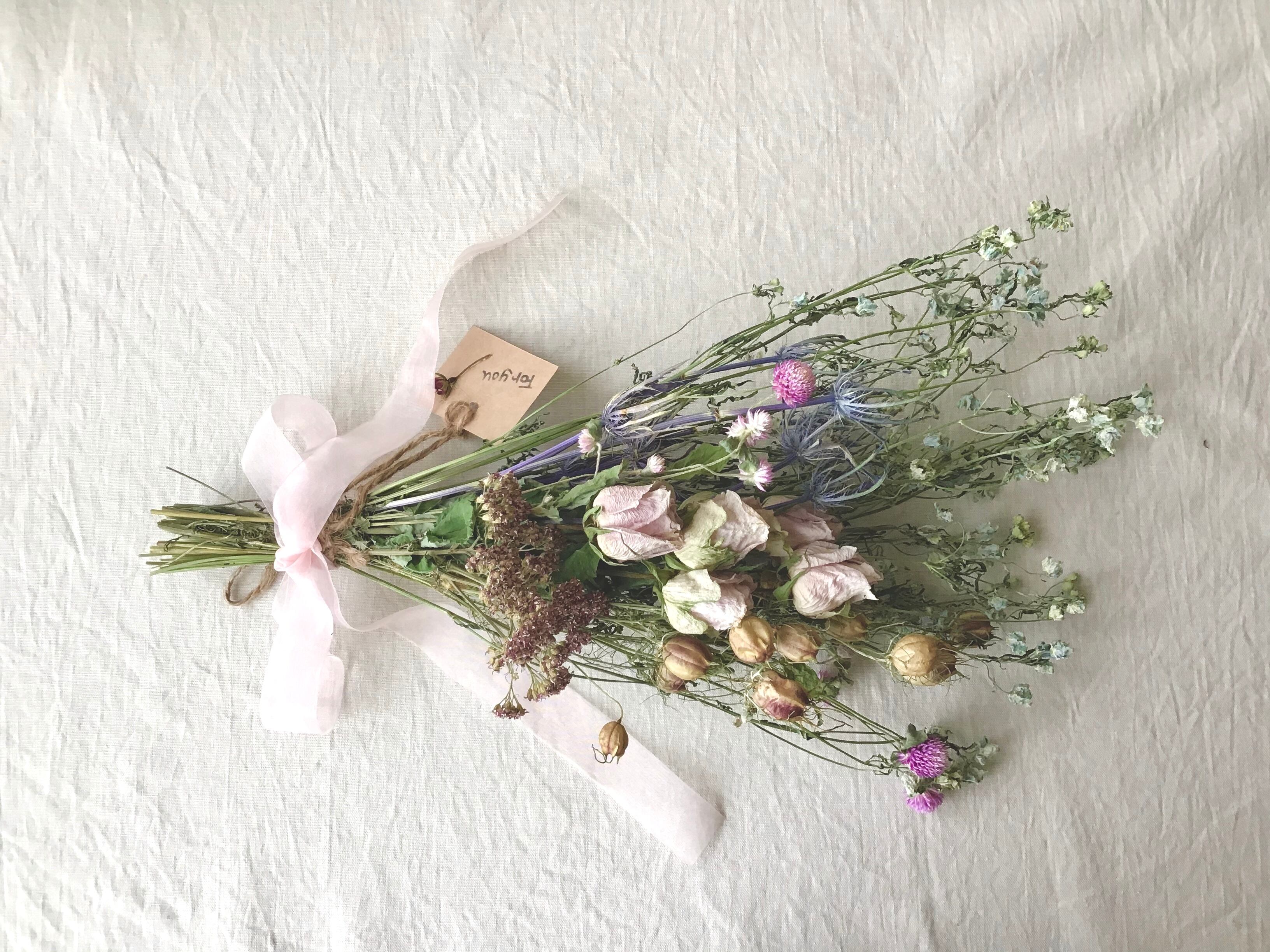 ドライフラワーですので時とともに退色していきますがアンティークな風合いもお楽しみいただけます