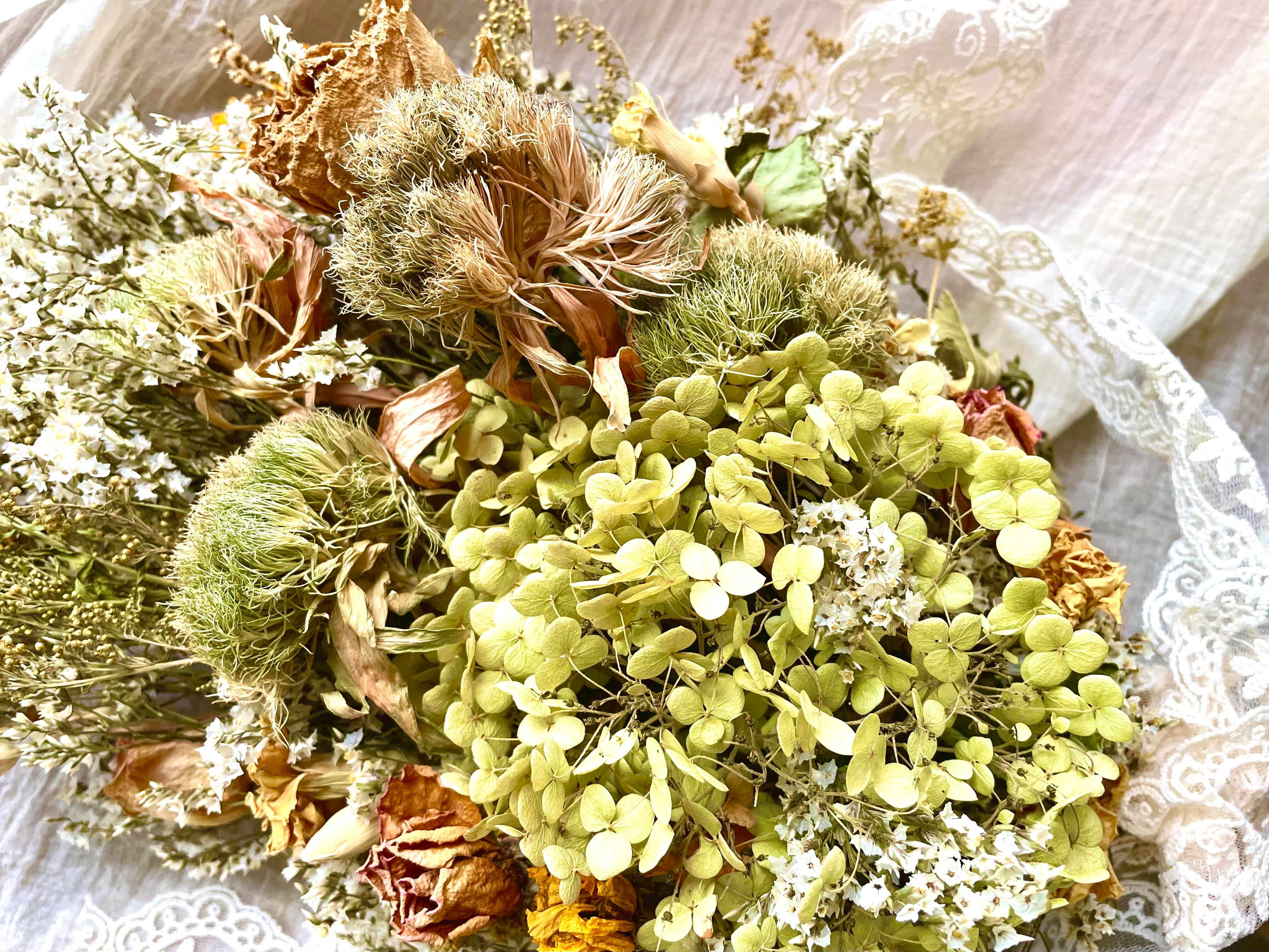 *ドライフラワーですので時とともに褪色して行きますがアンティークな風合いもお楽しみいただけます
